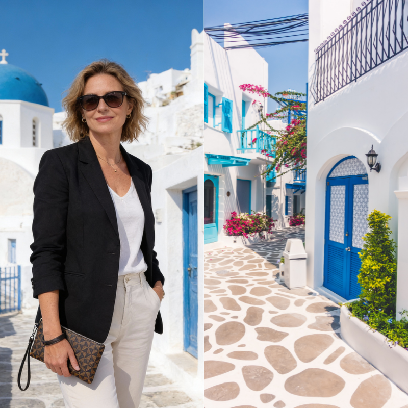 ''Es ist ein warmer Tag auf Mykonos. Die Sonne taucht die weißen Gassen in gleißendes Licht, das Meer schimmert türkisblau und eine leichte Brise trägt den Duft von Salz und Sommer durch die Luft. In meiner eleganten, zeitlosen Brieftasche ist alles sicher verstaut, was ich brauche – Karten, Schminke, ein Hauch von Alltag, perfekt organisiert.''