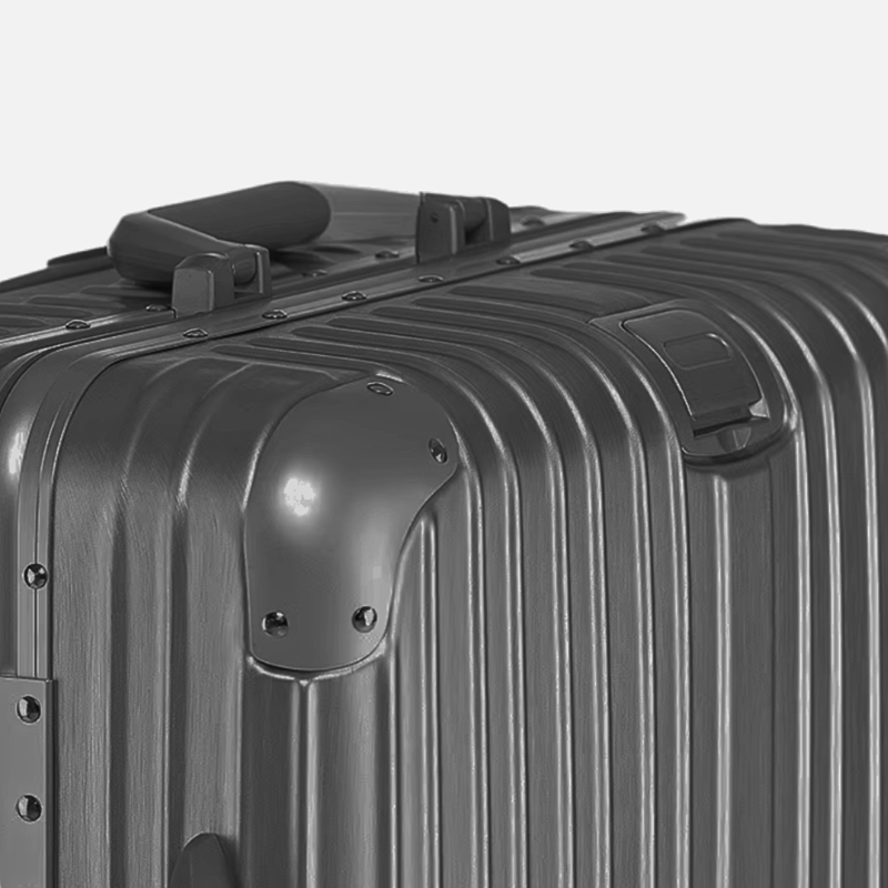 Der robuste Kantenschutz aus Aluminium verleiht dem Koffer zusätzliche Stabilität und schützt ihn zuverlässig vor Stößen und Abrieb. Präzise verarbeitet, fügt er sich elegant in das klare Design ein, ohne aufzutragen. Ein durchdachtes Detail, das Langlebigkeit und Sicherheit kombiniert und den Koffer auf jeder Reise zuverlässig bewahrt.